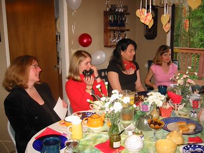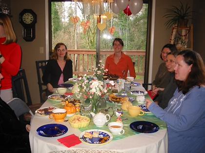 | Victoria, Jean, and Kelly put on a tea party for me at Jean's house. What a festive table setting! | |