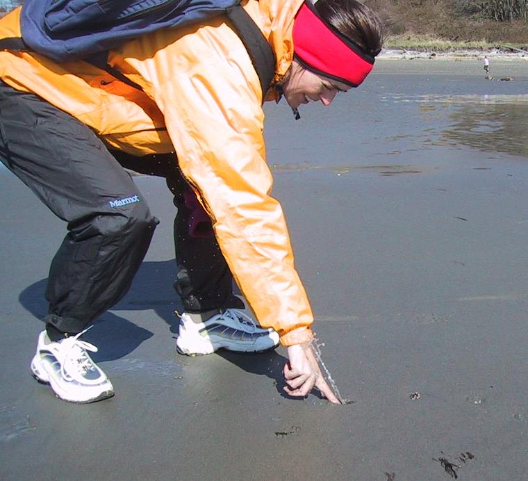 Playing with the geoducks. If you press the little dimple in the sand that marks their location, they often squirt water at you.