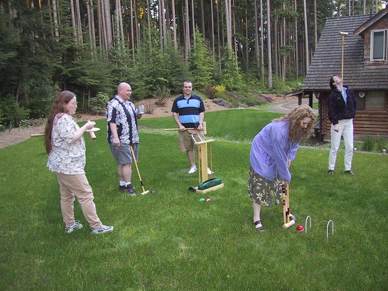 Engagement party for Tom Fakes and Lisa Whitaker - playing croquet in the backyard.