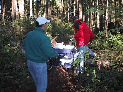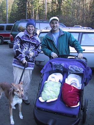 Steve and Eric manhandling the stroller between trees and across massive roots. I don't think Steve and Ilana will be taking this trail again soon with their double stroller!