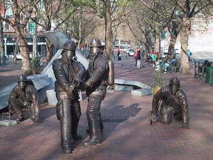 A firefighters monument in Pioneer Square. Many, many homeless people as well.