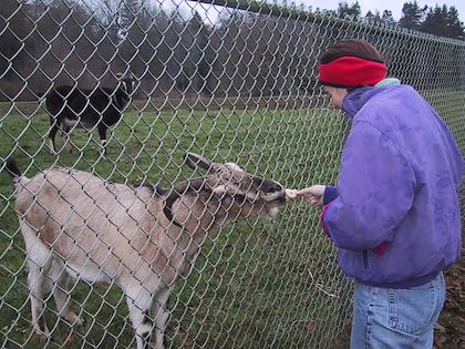 Feeding the goats. This goat managed to get stick his snout quite a ways outside the fence.