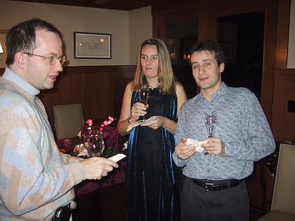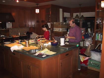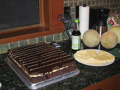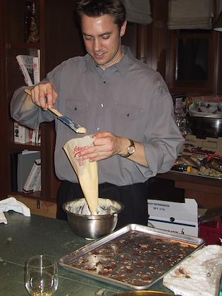 Note that the pie to the right is smushed. Apparently one of the caterers put their hands down to lean on the countertop, right on top of the pie. Luckily there were spares.Terry, Christian, Laurent, and Sylvia
