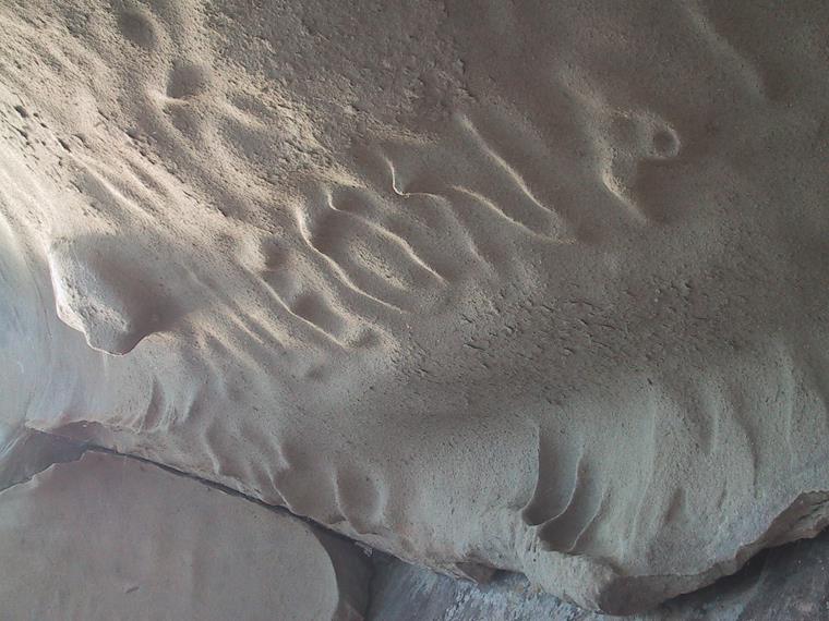 People had carved their names in the sandstone. After it eroded, it looked as though their names had been carved in relief. I assume that carving the names had compressed the stone right underneath it, and caused it to better withstand erosion.