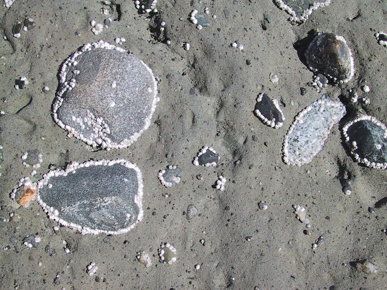 Barnacles formed just along the edges of where the stones lifted out from the sand.