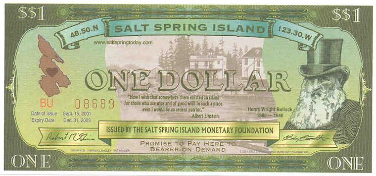 The Salt Spring Island Dollar. They have their own currency there. Apparently accepted in some stores.