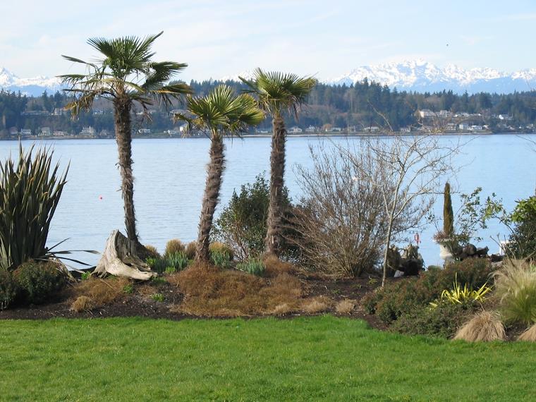 Walking through a very nice neighborhood to get to Fort Ward park. I had to get a picture of the palms with the Olympics in the background.