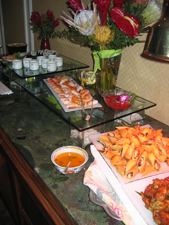 Hors d'oeuvres that evening were chicken wings, lumpia, crab legs elegantly cut, gazpacho, and sushi