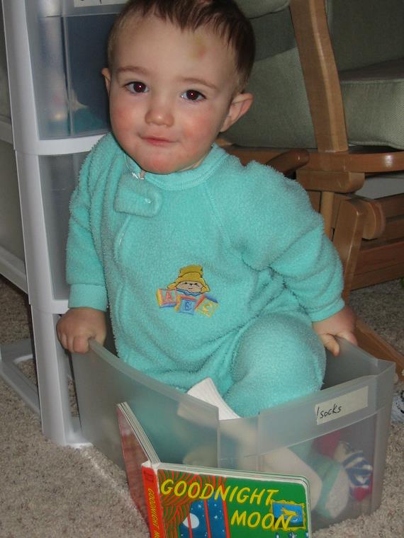 Sitting in his drawer. He has a bump on his forehead from falling at the playground