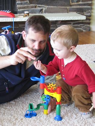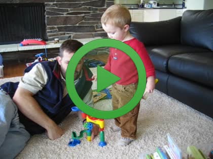 | A firefighter puts on his protective suit | | Playing with a marble drop toy with Daddy |