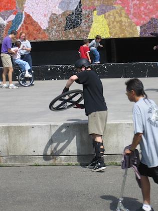|  | |  | | And you're allowed to feed the deer | | At the Seattle Juggling Festival, this guy had a very unique (and apparently very difficult to ride) seat-less unicycle. |
