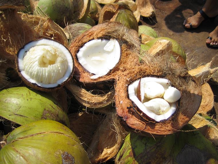 The coconut on the left and right have "manzanitas de coco" which are spongy fruits that form inside them when they've sprouted. When they're small, they're tasty, but when they get larger and fill the whole cavity, they're dry and tasteless