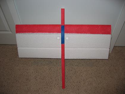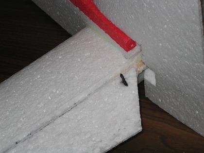 Next is the elevator/stabalizer construction. The two pieces of the elevator are attached by a wood tierod which is epoxied into a cut I had to make. This was one of the toughest parts of the construction. Then, the elevator is hinged to the stabalizer. Mine's a bit crooked.The the rudder is then attached. This was difficult because there was a hole in the fuselage where a piece of wood was installed to stiffen the fuselage. This blocked where a hinge had to go. I CA'ed a piece of foam into the hole then attached a hinge into the foam. Much cutting of foam had to take place. Measure twice, cut once!