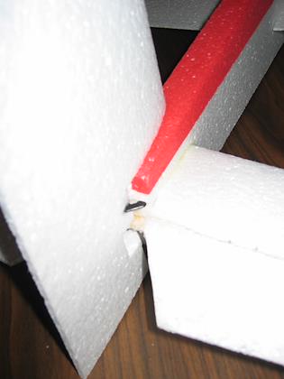 First I installed carbon fiber strips in the wings (the blackline). This gives the wing extra stiffness and strength.The the wing is inserted into the wing shaped hole in the fuselage and CA is applied at the joint to glue them together. CA stands for 'cyanoacrylate ' and is, basically, super-glue. Because the TUff-E is made of EPP foam (Expanded Polypropylene) the CA does not eat it up like it would with regular foam. Who knew I would learn so many new terms!