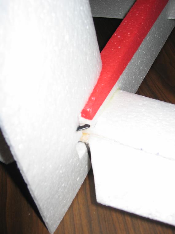 The the rudder is then attached. This was difficult because there was a hole in the fuselage where a piece of wood was installed to stiffen the fuselage. This blocked where a hinge had to go. I CA'ed a piece of foam into the hole then attached a hinge into the foam. Much cutting of foam had to take place. Measure twice, cut once!