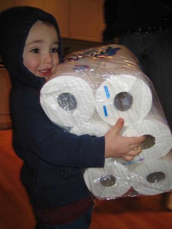 Helping to carry in some toilet paper