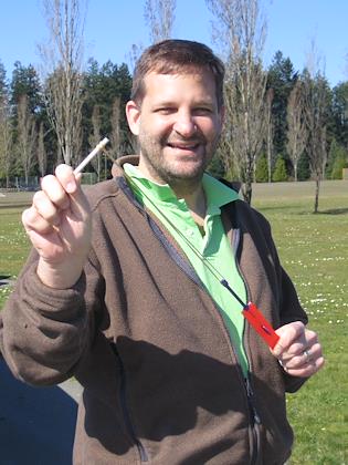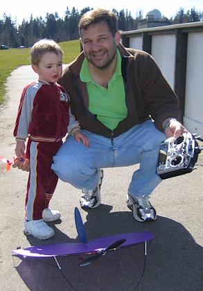 Eric hooked up the toy helicopter to release from his model plane, instead of shooting it up with the rubber band. It worked quite well.
