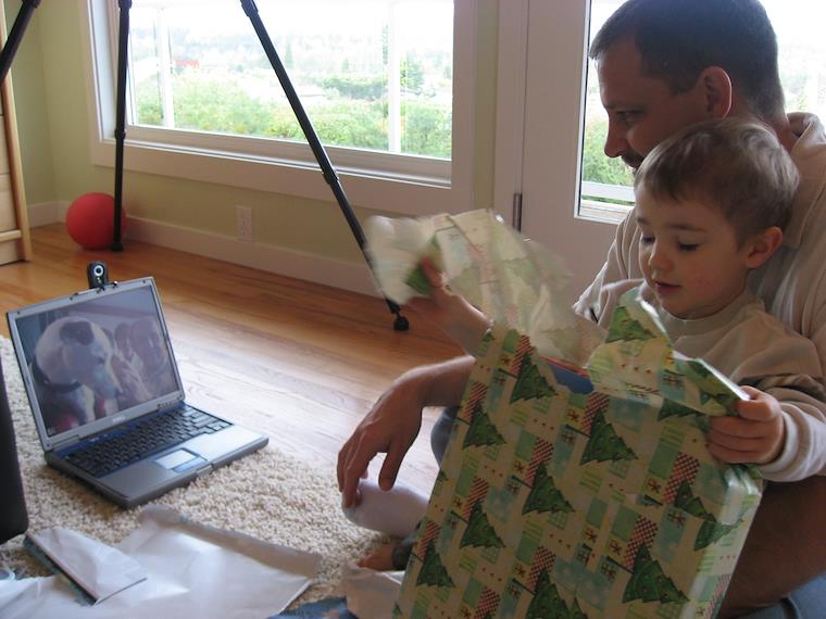 Christmas morning - webcamming with Grandma and Grandpa and family in Asheville