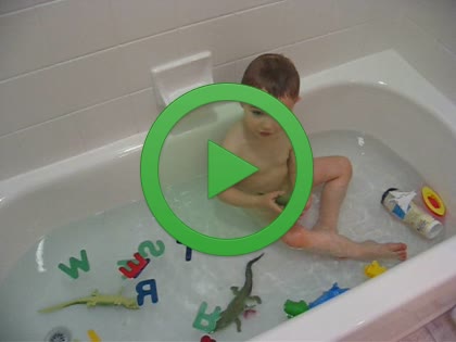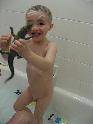 Kenny getting a bath after a haircut. Also, this is the first bath using the regular tub, instead of the baby tub