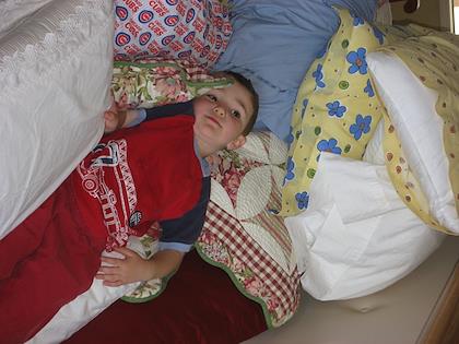 Kenny loves when Rachel makes big piles of pillows for him to jump into