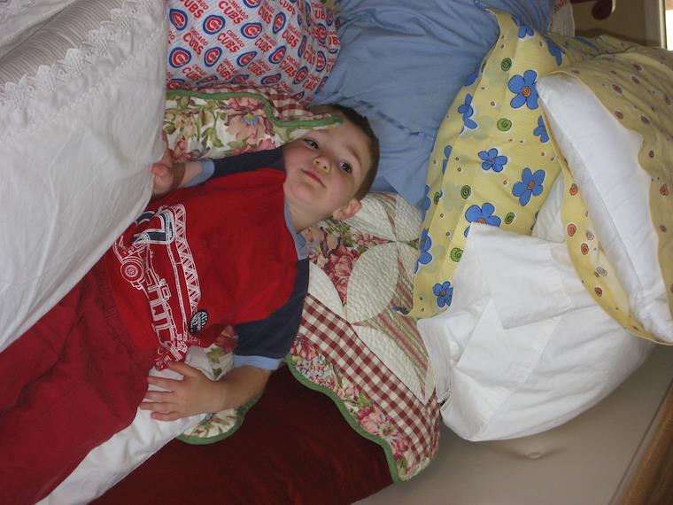 Kenny loves when Rachel makes big piles of pillows for him to jump into