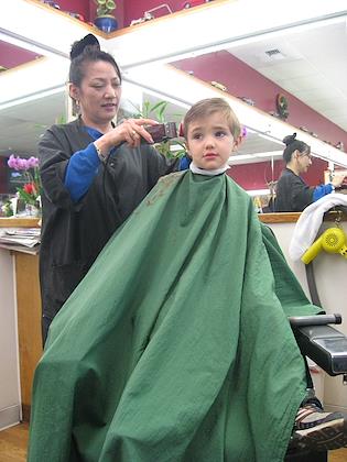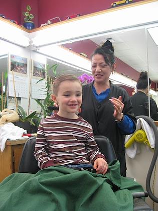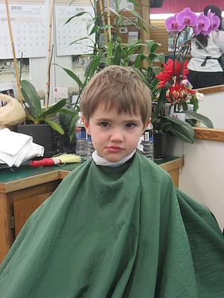 | Kenny gets his first professional haircut! Up till now, I'd always cut his hair at home. The Before picture | | During |