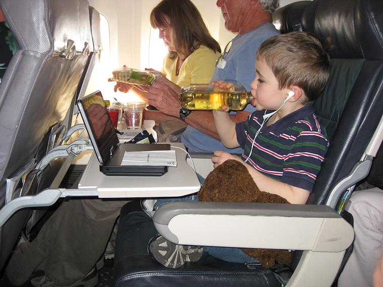Kenny's all set for the flight with his teddy, dvd, and some juice.