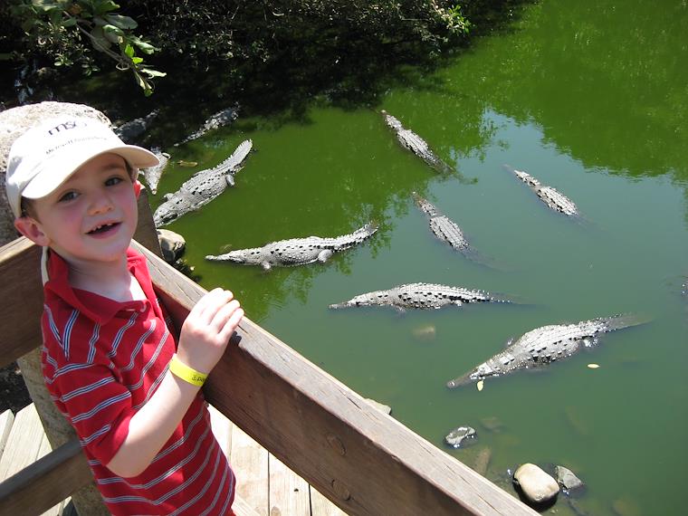 At the crocodile pit at Playa Linda - Kenny's pretty flushed with the heat