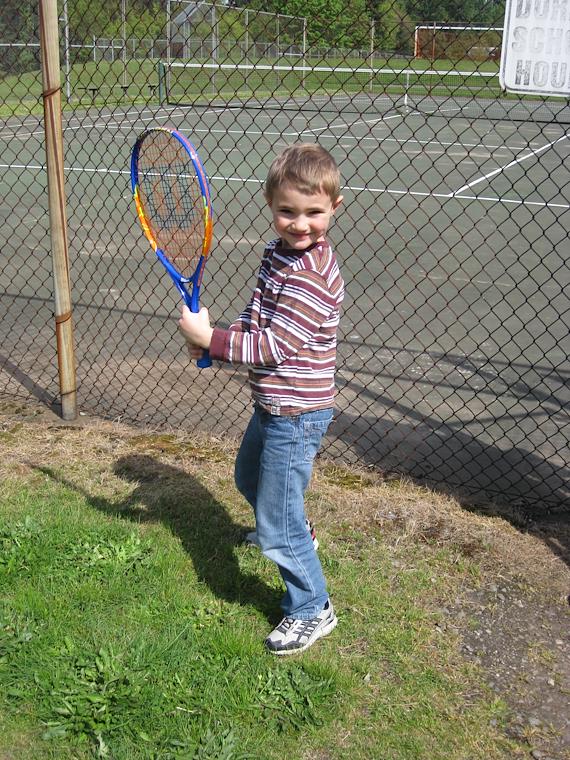 Kenny is thrilled to have his own tennis racquet, and we hit the ball around occasionally at Tyee middle school