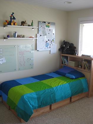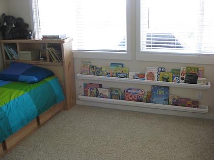 |  | |  | | | I redecorated the kids room - fresh paint, whiteboard, magnet board and shelves on the wall, a rain gutter bookshelf, and new linens. |