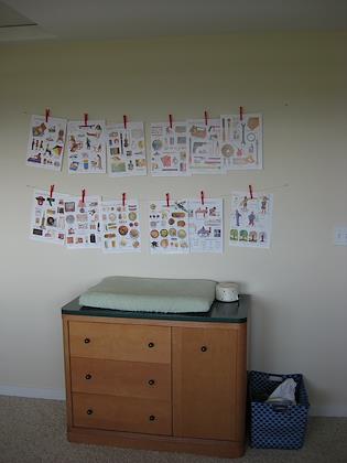 |  | |  | | These are the rain gutter bookshelves. I found the idea online - it really works well, and is super cheap | | I hung a bunch of pictures up on the wall (cut out from a book) on clothespins |