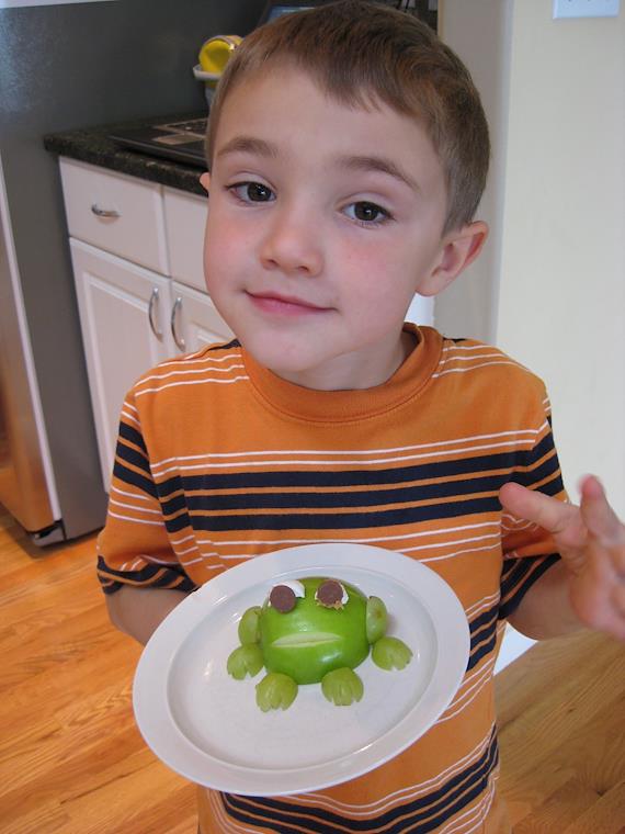 Making a green apple frog, with grape toes.