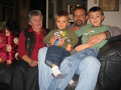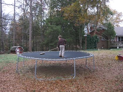 | Oma, Peter, Eric and Kenny. | | Conrad cleaning the trampoline at Alex and Juanita's place. Much bouncing was had. |