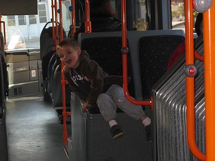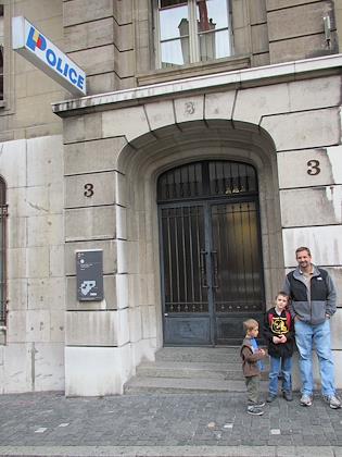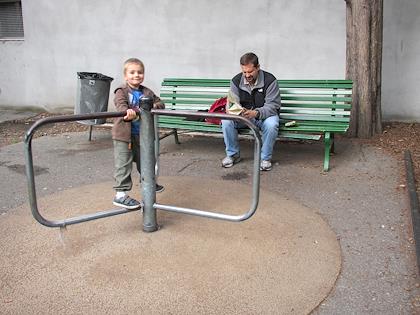 | Unusual playground structure. This spun around. Ripe for injury. Eric is inspecting a bus map in the background. | | Eric found a women's wallet in the trash which had obviously been thrown away after a mugger/pickpocket stole it and extracted anything of value from it. We were instructed to go to the local police station, but it was closed when we go there. "Banker's hours" seem to apply to most endeavors here. |
