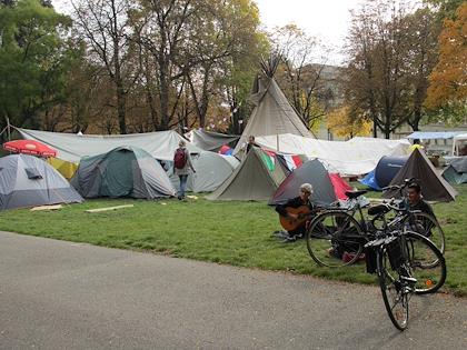 | Evidently this is the longest wooden park bench. | | We found an Occupy <Something> gathering in the main park during their Kumbaya moment. |