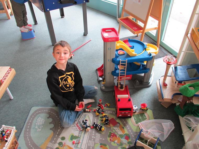 At the toy library. It's a neat thing they have here - a place kids can check out toys, and also play with them. Great for rainy days, and Wednesdays, when there's no school.