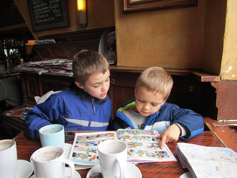 Kenny and Peter "reading" comics while we are at a coffee shop (not that kind of coffee shop!).