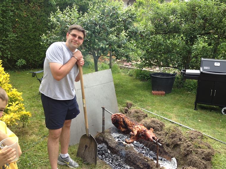 Roasting a pig at a coworker's house