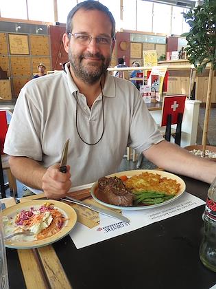 | At the demonstration factory that produced Gruyere cheese | | Eric about to eat a horsemeat steak. I tasted it. What can I say? Kind of tastes like beef. |