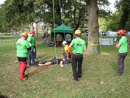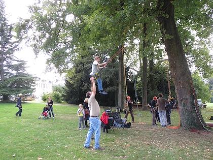 Parc la Grange next door had a tree-climbers competition, with timed tree-top rescues, races up a tree to ring a bell, etc.The kids loved this monster swing, which was unfortunately shut down shortly after this picture because there'd been a safety concern