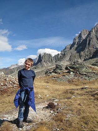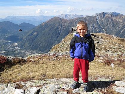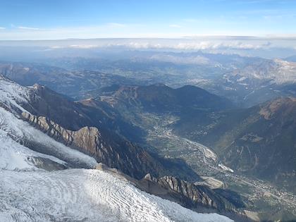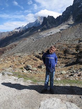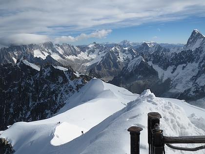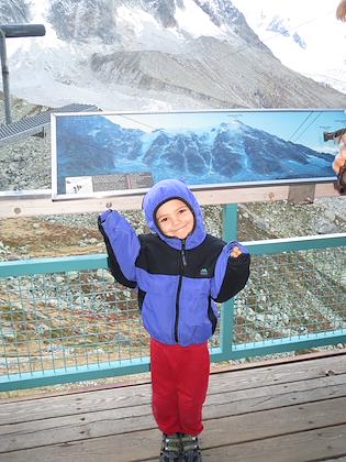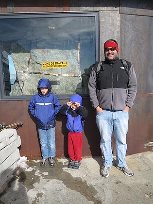 At the Aiguille du Midi cablecar, with a view of Mont Blanc. Man was it COLD! We should have brought much warmer clothing. Plus Eric left his shell jacket at home. Luckily we had beautiful weather.