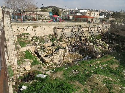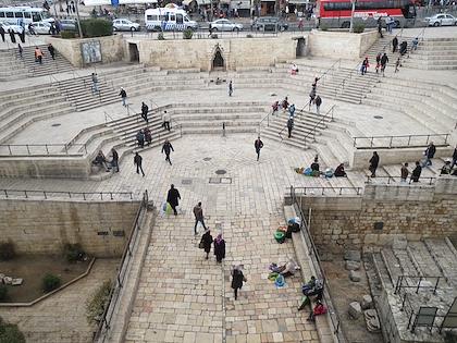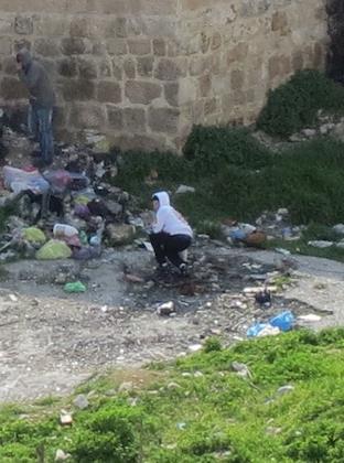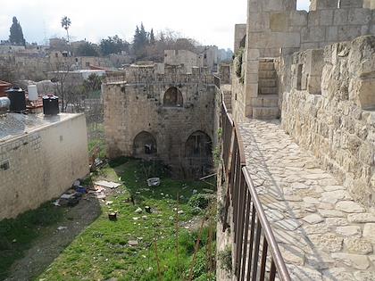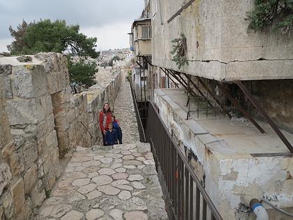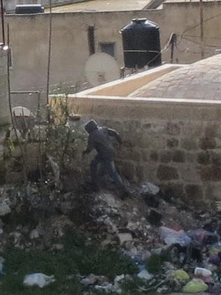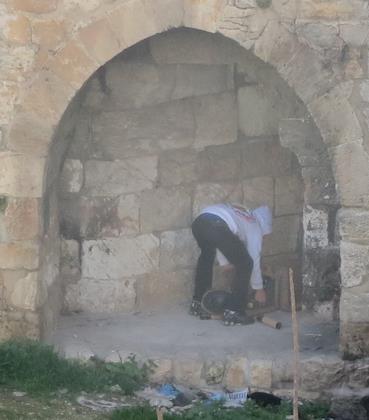 | We continued on the wall along the Muslim Quarter. While looking at a rather interesting site with a combination of ancient ruins, modern "fortifications" and trash, I heard a comotion behind me ... | | ... I turn to see a couple of young men hastily making their way through the base of the wall. |
