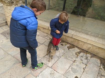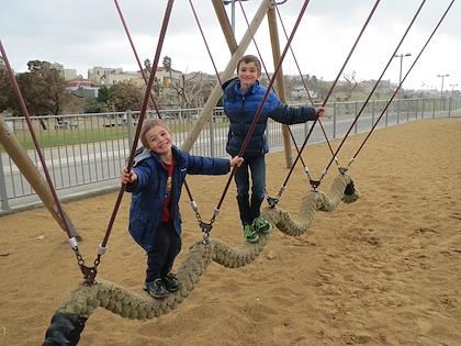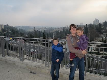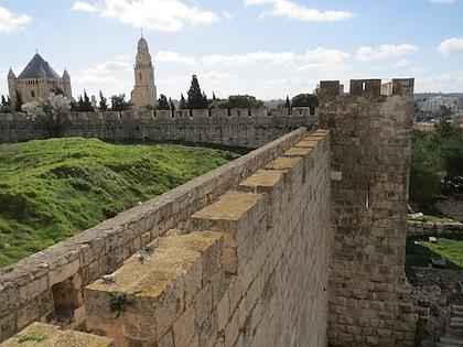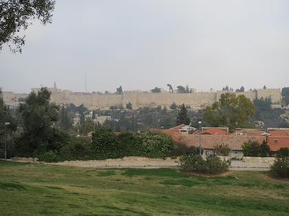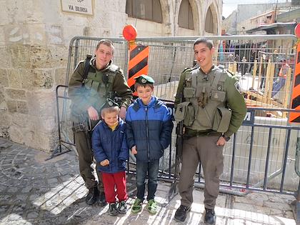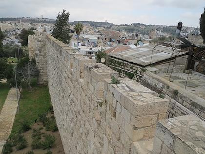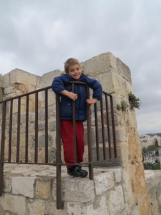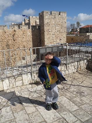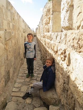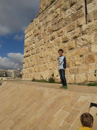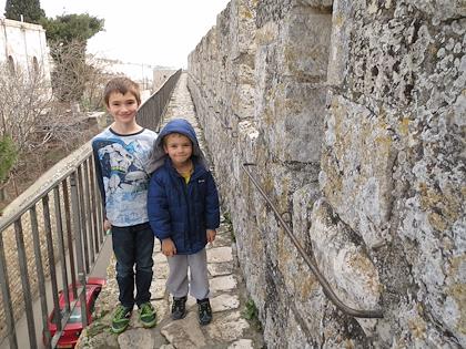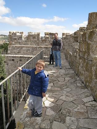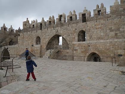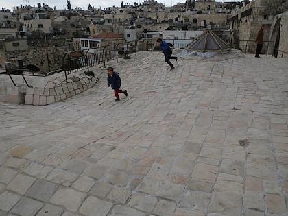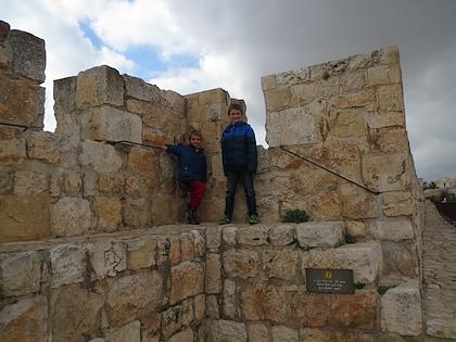 |  | |  | | We walked past a huge group of orthodox kids playing some very energetic games on this playground. | | Later on we saw a guy guarding them, further along on the city wall. |