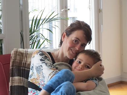 | Peter has the habit of taking his blanket and sleeping on the hard wood floor. He says it's so that he can see outside | | Trying to get Kenny to make a photo of Peter and me together. I think it would have worked better had we not been looking at the camera |