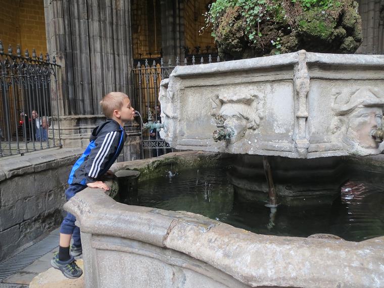 Getting a drink at the Barcelona Cathedral courtyard fountain