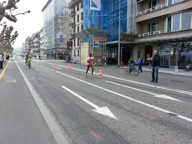The first place winner at the Geneva Marathon. It was on the Mont Blanc bridge close to our apartment, so we went to see the action.