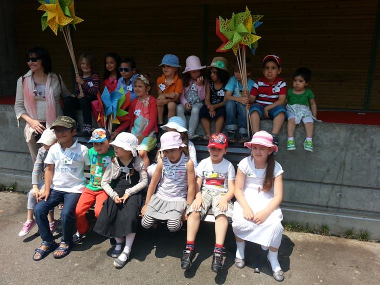 End of school concert and parade, kids visit UN, Peter's sixth birthday, visiting the Oujon ruins, and walking along Lake Geneva from Morge to Saint Sulpice.