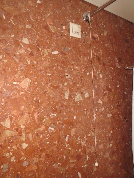 In our hotel room, this little emergency/SOS cord is required by law. The same was required in Spain. Seems like a prime example of government regulations going overboard. Note that it's looped around the shower curtain rod a few times, which of course makes it nonfunctional. I wonder what would happen if you actually did pull it.