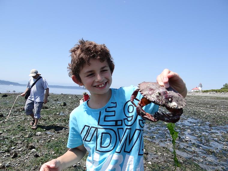 Around the lighthouse in West Seattle - Timothy finds a dead crab