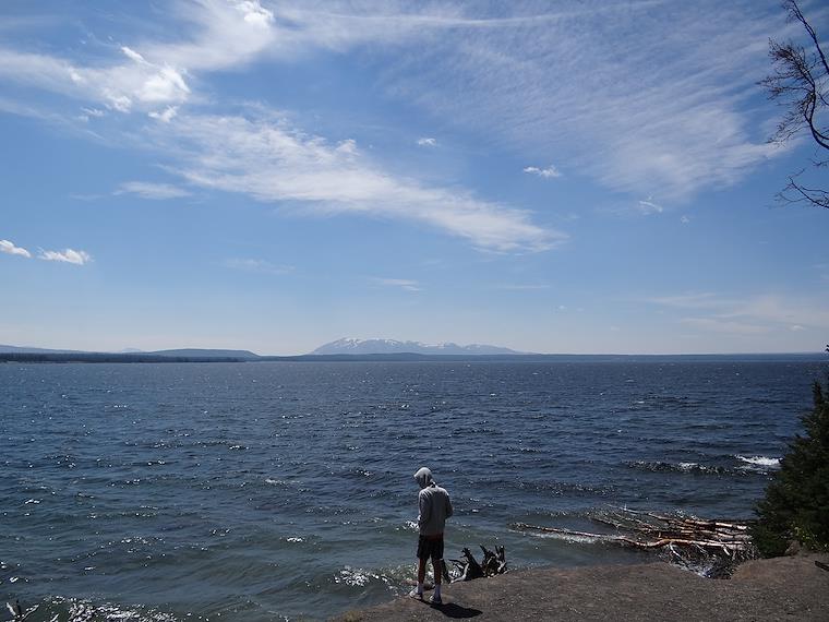 At Yellowstone Lake. We were too tired to do much besides stumble out of the car at a pull-off, but it was beautiful.